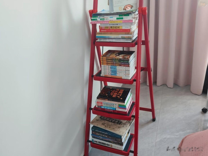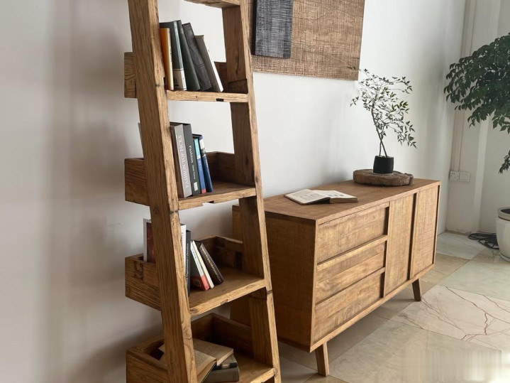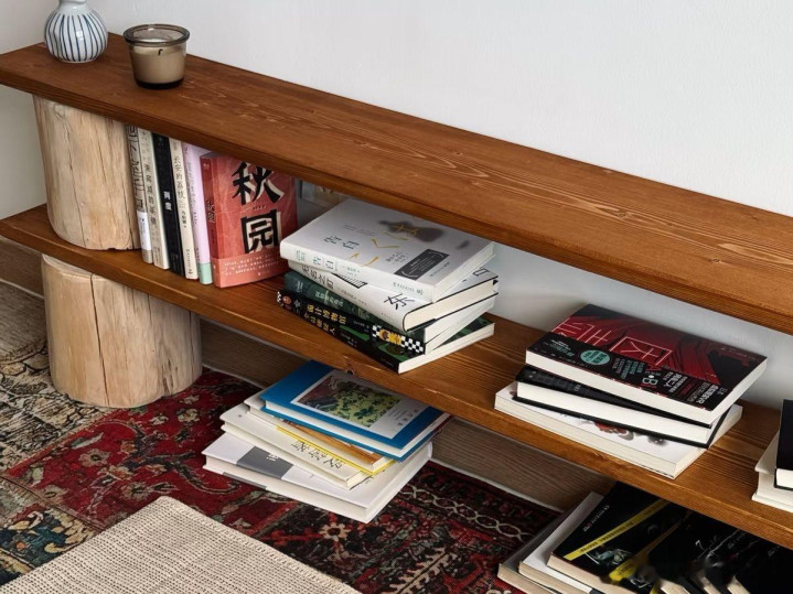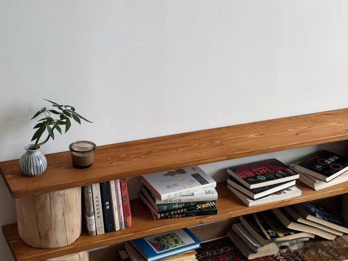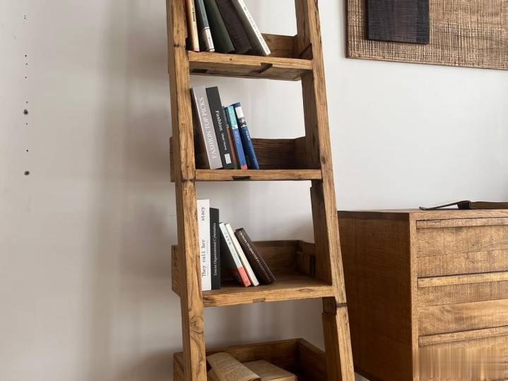 据纪老师介绍说:他是将梯子清洁打磨,然后水平固定在了墙上。每层横担就当成了天然的书架,而且是倾斜的设计,让取放书都很轻松。同时,还能创造视觉上的动态感。