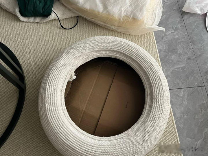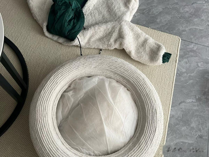 老师介绍,他家的这几个轮胎是他的车子换下来的,没有扔,被清洗后叠放固定。中间又填充了海绵,再用旧毛衣还有帆布,包裹缝合就制作成了成个性十足的休闲坐凳。