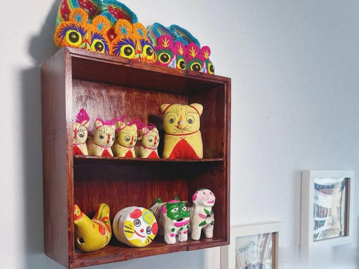 看到他家的布置,我发现每个抽屉能存放不同类别的小物件,同时又成为了墙面的立体装饰。而且是开合的设计,取物也很方便。